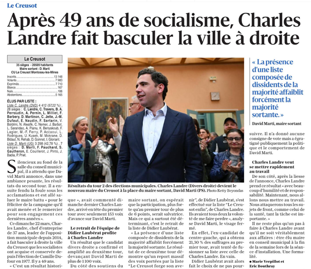 RÉSULTATS. Municipales : après un demi-siècle de socialisme, Le Creusot bascule à droite, Charles Landre l’emporte largement face à David Marti