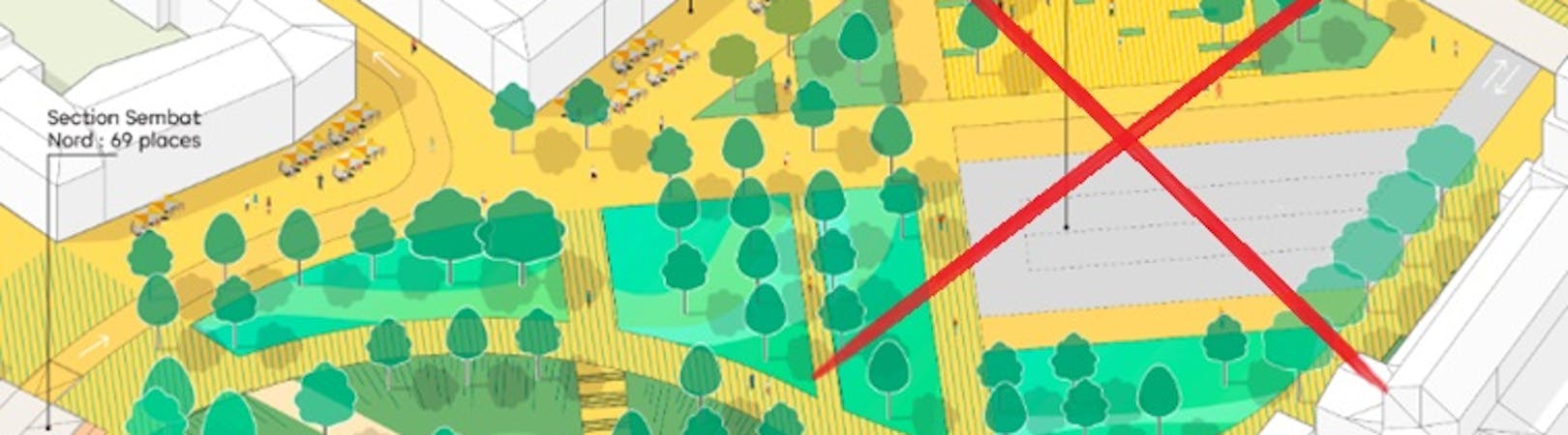 Le cabinet mandaté par la ville recycle ici toutes les idées d’aménagements vues et revues dans des espaces urbains extrêmement denses comme Paris. Plantations d’arbres, zones bleues, espaces de déambulations…